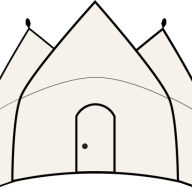 The living room adjoining the kitchen has a characteristic cone-shaped roof.